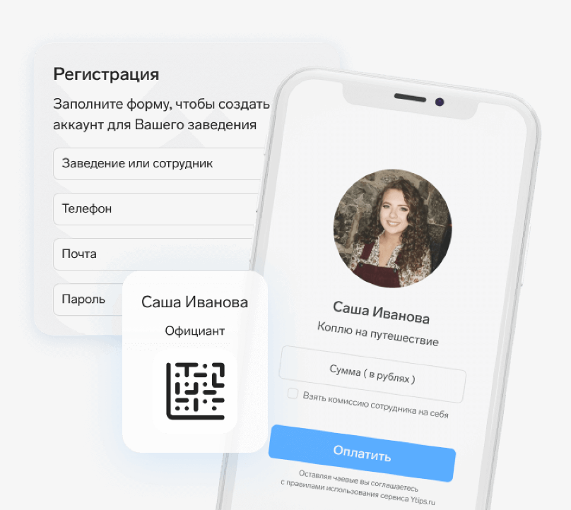 Гость считывает QR-код телефоном — деньги приходят официанту или заведению.