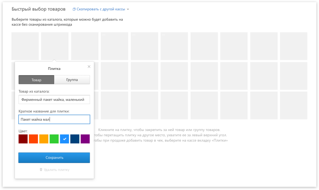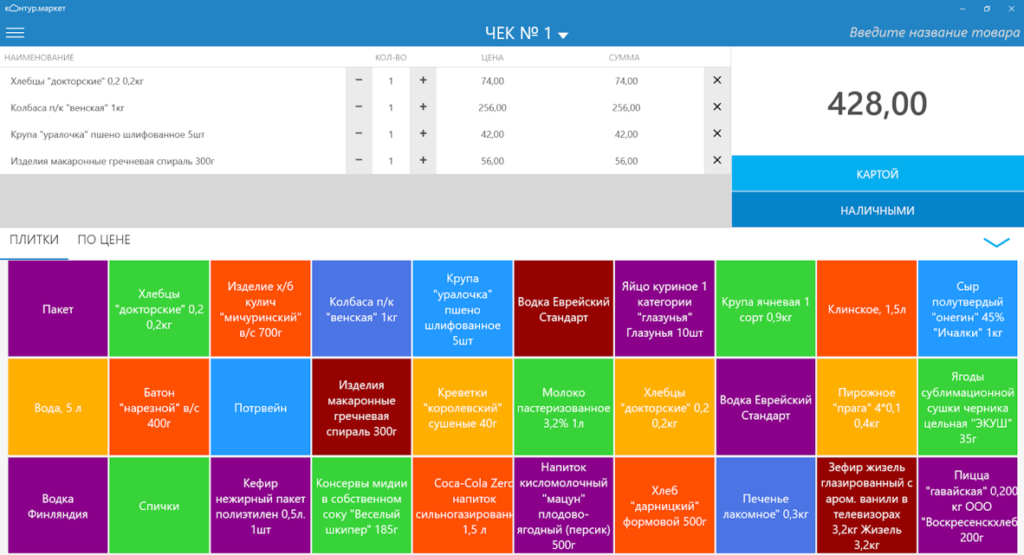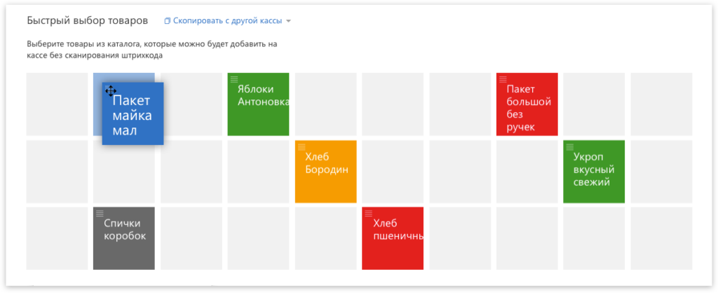 Если товар пользуется хорошим спросом или не имеет штрихкода, для него можно настроить кнопки-плитки для быстрого ввода в чек. Кассир будет тратить меньше времени на поиск товаров в каталоге — популярные позиции он видит на экране кассы, до 30 плиток одновременно.