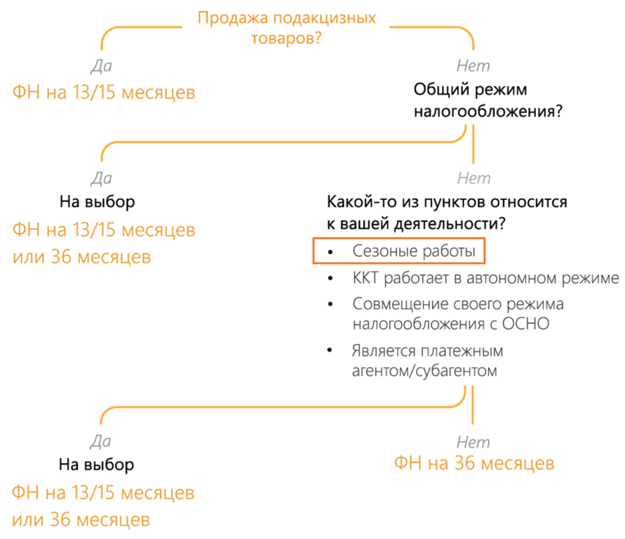 По закону перечисленные категории обязаны применять ФН на 36 месяцев, но при сезонных работах имеют право работать с ФН на 13, 15, 18 месяцев (п. 6 ст. 4.1 № 54-ФЗ).