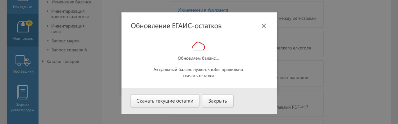 Ссылку «Скачать ЕГАИС-остатки» пользователь нажимает в подразделе «ЕГАИС» раздела «Мои товары»: