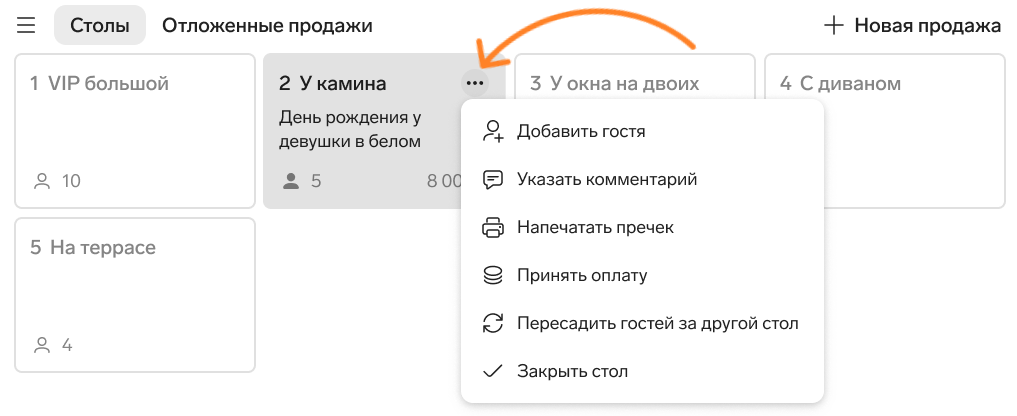Когда пользователь откроет новый столик в кассовой программе, он может добавить комментарий: важную деталь о госте или заказе. Там же есть кнопка «Пересадить гостей за другой стол».