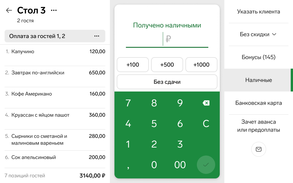 Теперь в кассовой программе Маркета по каждому гостю и его заказу формируется отдельный чек. Это значит, что можно рассчитать гостей за столом разными способами: